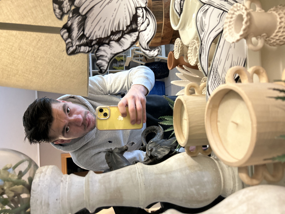 This image depicts a male individual's mirror reflection captured as a selfie within an indoor environment in Marousi, Greece. The male subject, positioned centrally, has short dark hair and stubble, and wears a light grey hooded sweatshirt with a dark emblem on the left chest. He holds a yellow smartphone in his right hand, pointed towards his reflection, with his eyes directed towards the camera. The immediate foreground and midground feature a display of decorative objects. Two light-colored cylindrical candle holders with handles, each containing an unlit candle, are prominent; the nearest one displays green linear patterns on its base. To the left, a tall, light-toned pedestal or vase is partially visible. Further back, a dark statue of a horned animal, possibly an elephant head or ram, and another dark equine statue are present, interspersed with green succulent-like foliage. A tall lamp with a light-beige fabric shade partially frames the right side of the reflection. On the surface beneath the lamp, multiple smaller ceramic or clay vessels are arranged, some with textured surfaces. Portions of a monochrome graphic print, depicting a large floral or organic design, are also visible. The background reflection shows a light-framed doorway, a plain wall, and white shelving units on the right, along with a blue container.