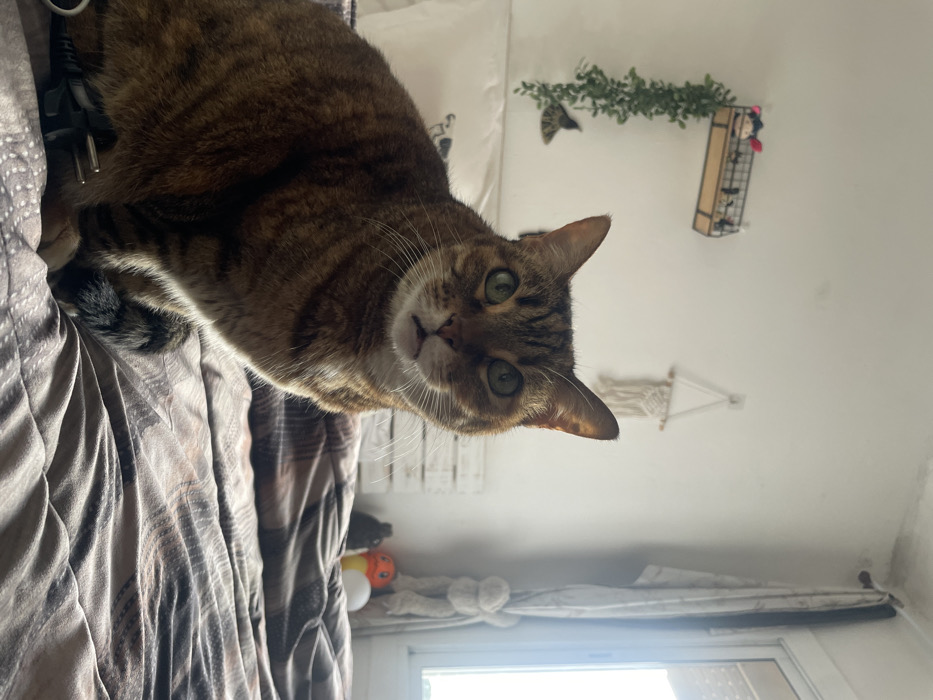 - "An indoor scene within a residence in Canet de Mar, Spain, depicts a medium-sized tabby cat seated on a bed" by FM-T5EOT2, licensed under CC BY 4.0