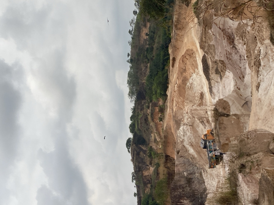 The image displays an active quarry site in Achara, Nigeria, under a heavily overcast sky