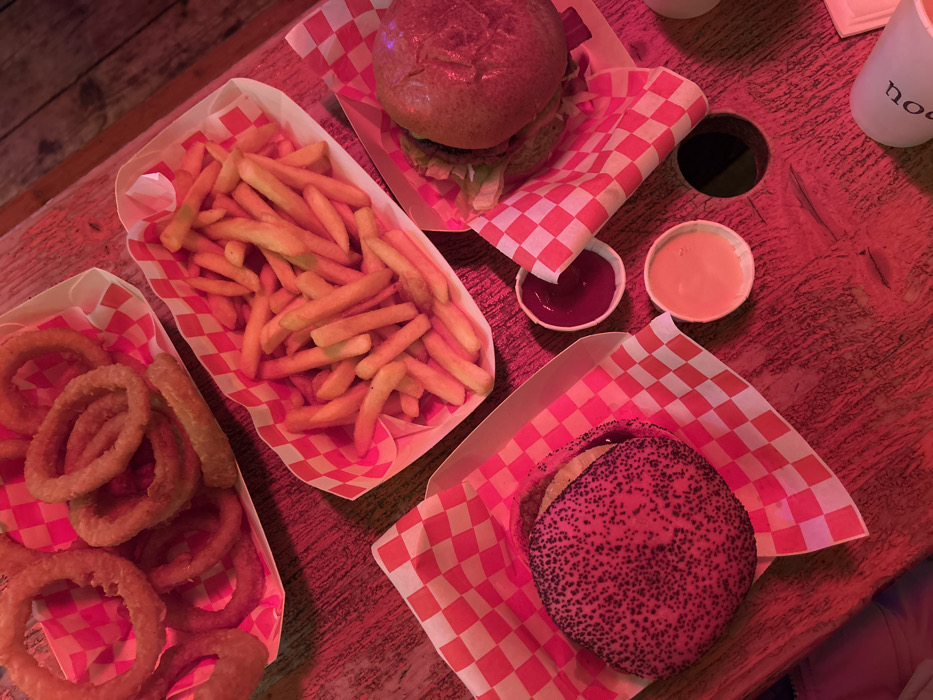 A wooden table displays fast food: onion rings, fries, and two hamburgers, served in paper trays lined with red and white checkered paper. Condiments in small white bowls, including ketchup and a creamy sauce, accompany the meal. A black hole in the wood and a white mug are also present on the table. The scene is illuminated by red lighting.