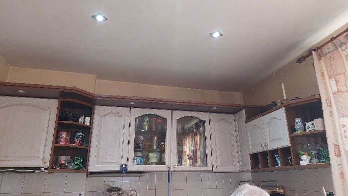The image depicts an indoor kitchen environment in Dupnitsa, Bulgaria, viewed from a low angle looking upwards. The ceiling is white and features two illuminated square recessed lights. The upper wall section is painted a light beige-brown. A continuous run of upper kitchen cabinets, primarily light-colored with dark brown trim, spans the mid-ground. From left to right, the cabinet sequence includes: 1. A solid-door cabinet on the far left. 2. An open shelving unit displaying various packaged items and a black bag on the top shelf. 3. Two central cabinets with glass doors, revealing an assortment of colorful kitchenware, including cups and containers. 4. Another solid-door cabinet. 5. An open shelving unit on the far right, containing items such as a water bottle, mugs, and a white ceramic figurine. Above this section, on the top ledge, a single white tapered candle stands in a holder. Below the cabinets, a light-colored tiled backsplash is visible. On the far right of the frame, a patterned curtain, predominantly brown and beige with a geometric design, hangs from a dark rod. The top of a person's head, exhibiting light-colored hair, is partially visible in the bottom right corner of the frame.