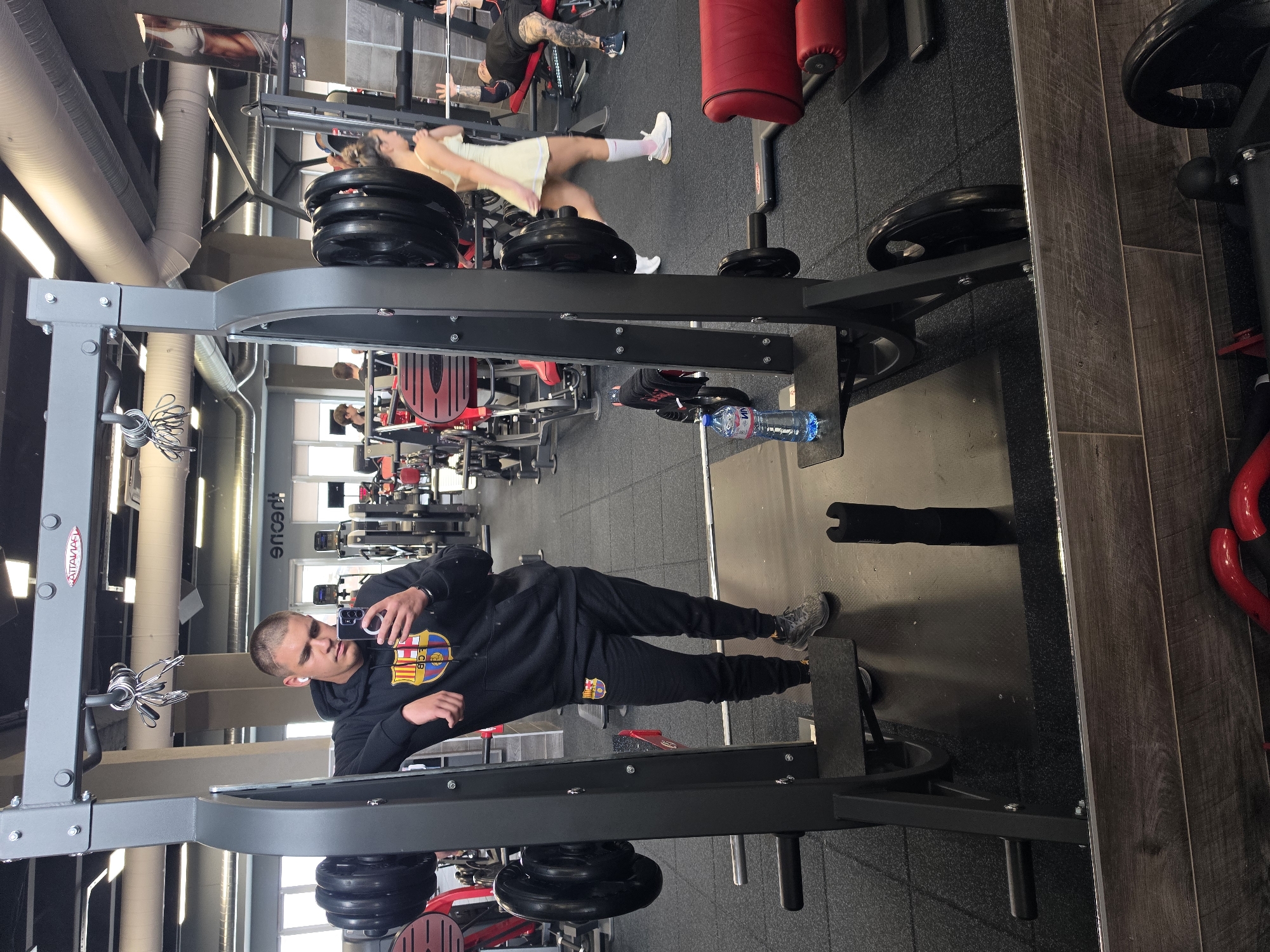 The image depicts the interior of Attana Gym, located at Ул. „Ком“ 2, 6300 Haskovo, Bulgaria. In the foreground, a young adult male is positioned, taking a mirror selfie with a dark-colored smartphone. He has short blonde hair, wears white wireless earbuds, a black hoodie with an FC Barcelona logo, black sweatpants also bearing an FC Barcelona logo, and dark athletic shoes. He is leaning on a dark grey metal squat rack loaded with multiple black weight plates on a barbell. A plastic water bottle with a blue cap, labeled "ВИНАРОВА", rests on a shelf of the squat rack. The floor is covered with black rubber matting. In the mid-ground, a female in a light-colored dress or romper and white knee-high socks is captured in motion, walking towards the left. To her right, a male with visible arm tattoos lies on a red weight bench, appearing to be engaged in a bench press exercise. Additional gym-goers and various fitness equipment, including other weight machines and benches, are visible throughout the spacious and well-lit facility. The gym's ceiling is high, featuring exposed metallic ductwork and rectangular overhead lighting. A wall poster depicting a human torso is visible in the background. A reflective surface, displaying the mirrored text "encert", constitutes part of the immediate foreground.