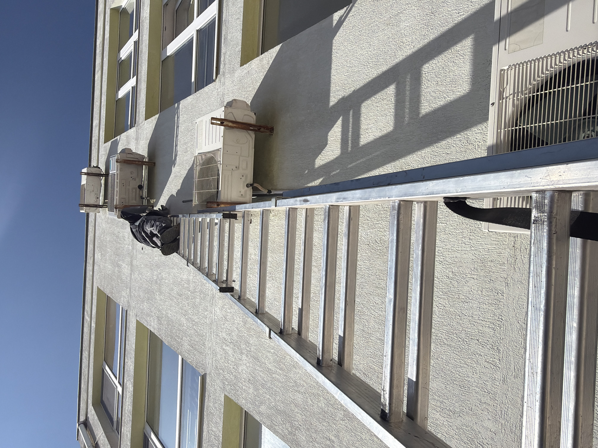 An upward-angled view captures the exterior of a building in Balchik, Bulgaria, under a clear blue sky. A tall, silver-colored extension ladder leans against the building's light-colored, textured facade. One individual, dressed in dark work attire, is positioned on the ladder, visible from the waist down, actively engaging with the upper reaches of the structure. Three white outdoor air conditioning units are mounted on the facade; one is partially visible at the bottom right, another is centrally located at the worker's approximate height, and a third is positioned directly above it. Both upper units display visible rust on their mounting brackets. Sunlight casts distinct shadows of the ladder and AC units onto the building surface.