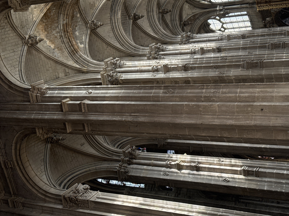 The image depicts the interior of the Basilica of Saint-Denis, located just north of Paris, France. The perspective looks along a nave or choir aisle, showcasing multiple rows of towering, slender stone columns. These compound piers feature fluted shafts and elaborate Corinthian-style capitals, supporting a series of pointed arches and ribbed groin vaults that extend into the upper structure. The pale grey limestone construction exhibits intricate detailing, including raised diamond patterns on the main piers. Natural light streams in from tall lancet windows to the left and a large traceried window on the far right, illuminating the scene and creating strong contrasts and shadows on the architectural elements. The upper vaults show minor discoloration and wear consistent with age. No individuals are visible. A small section of ornate, possibly gilded, wooden or metalwork is partially visible in the lower right corner.