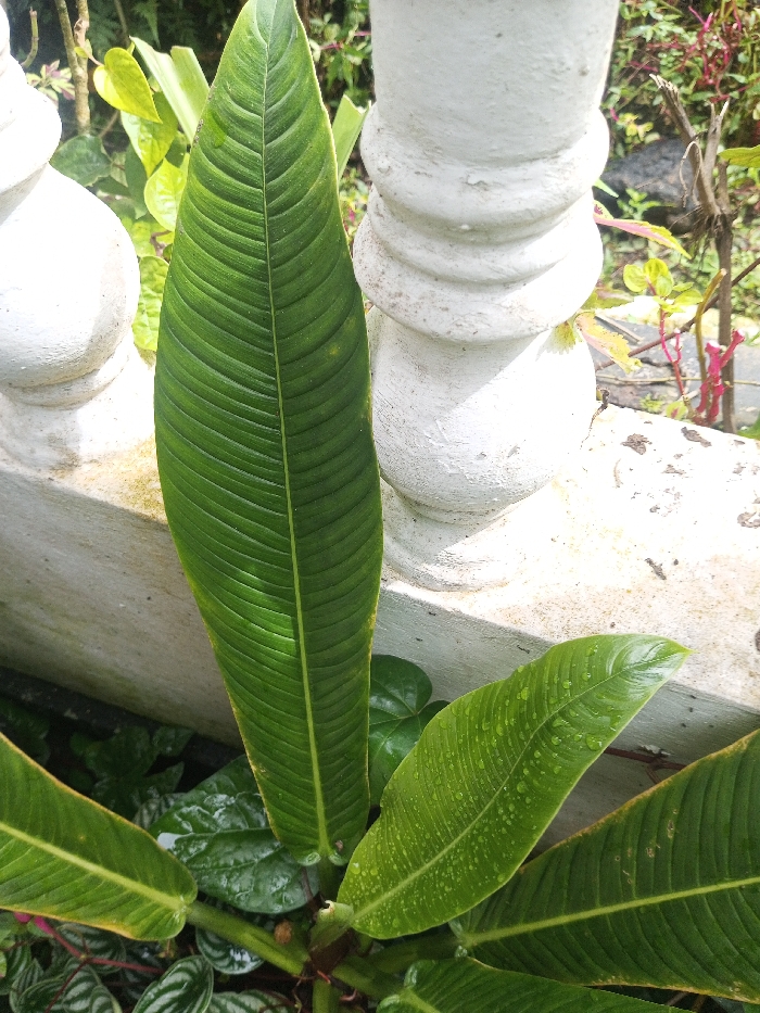 The scene is an outdoor close-up of foliage and architectural elements in Khammam, India. A large, elongated, dark green leaf, displaying prominent parallel venation, extends vertically through the central and left portions of the frame. To the right of this leaf, a white concrete baluster is partially visible, featuring a weathered surface with some discoloration and textured details, including a spiral or grooved section. A second, partially obscured white baluster is present on the far left. At the lower right, another green leaf with numerous visible water droplets is observed. The base of the scene includes various green plant leaves, some with distinct striped patterns, while the background consists of blurred green foliage and reddish stems, indicating a densely planted area. No human subjects, animals, or discernible actions are present. The environment appears naturally lit.