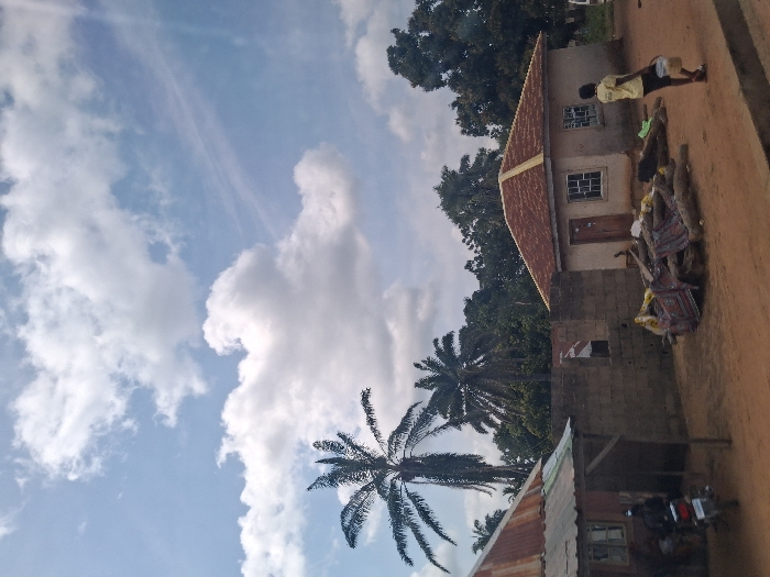 The image depicts a rural or semi-urban street scene in Takum, Nigeria, under a bright, partly cloudy sky. In the foreground on the left, a single-story structure with a rusty corrugated metal roof and exposed wooden supports is partially visible, with a dark-colored motorcycle parked underneath. To its right, a low, unfinished wall made of concrete blocks stands, behind which several tall palm trees and dense green foliage are prominent. In the center-right, a single-story house with light-colored, possibly beige, walls and a reddish-brown hip tiled roof features a brown wooden door and two windows with security grilles. On the unpaved, reddish-brown dirt ground between the concrete block wall and the house, a pile of cut logs and folded fabrics or rugs is present. On the far right, a person wearing a light-colored, short-sleeved top and dark shorts walks towards the right, carrying a white bucket in their left hand. A white vehicle is partially visible on the extreme right edge of the frame.