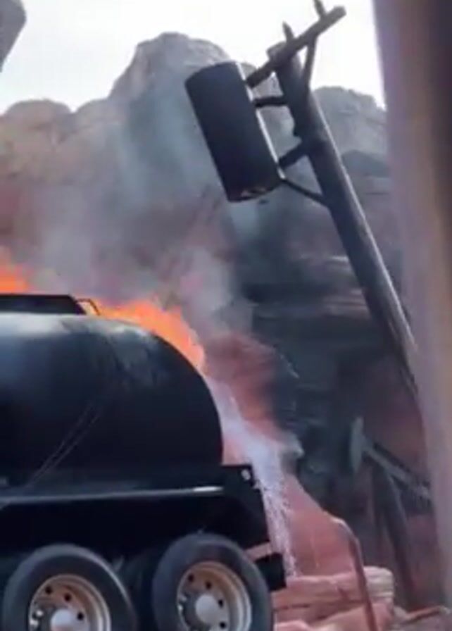 The video captures a scene from what appears to be a live performance or show. Initially, a black tanker truck is visible with flames emerging from its top, accompanied by smoke. A wooden utility pole stands nearby, partially obscured by the smoke. Then, from the perspective of an audience, the truck is doused in a large burst of water. The water cascades over the truck, forming a splash against a backdrop of artificial rock formations resembling a canyon landscape. The side of the truck is blue and contains the words "CO".