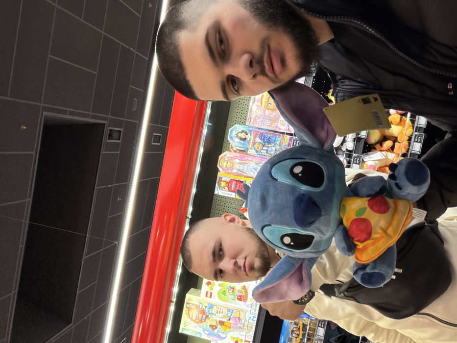 Two young adult males are positioned in a retail store, identified as being in Ivanyane, Bulgaria. The individual on the left has a close-cropped haircut and a short beard, wearing a light-colored long-sleeved shirt and a black fanny pack across his chest. His left arm extends behind the individual on the right. The individual on the right has a close-cropped haircut and a dark, full beard, wearing a dark jacket. Both are looking directly towards the camera. They are cooperatively holding a blue plush toy resembling the character "Stitch," which is dressed in a yellow garment designed to look like a pizza slice with red toppings. A light brown tag, bearing a barcode and a Disney logo, is attached to the plush toy. The background displays multiple retail shelves stocked with various packaged toys, including visible LEGO sets and Barbie dolls. Small black digital price tags are present on the shelves. The overhead environment features a dark, gridded ceiling with recessed lighting fixtures, ventilation grates, and horizontal strip lighting, along with a prominent red horizontal beam or fixture.