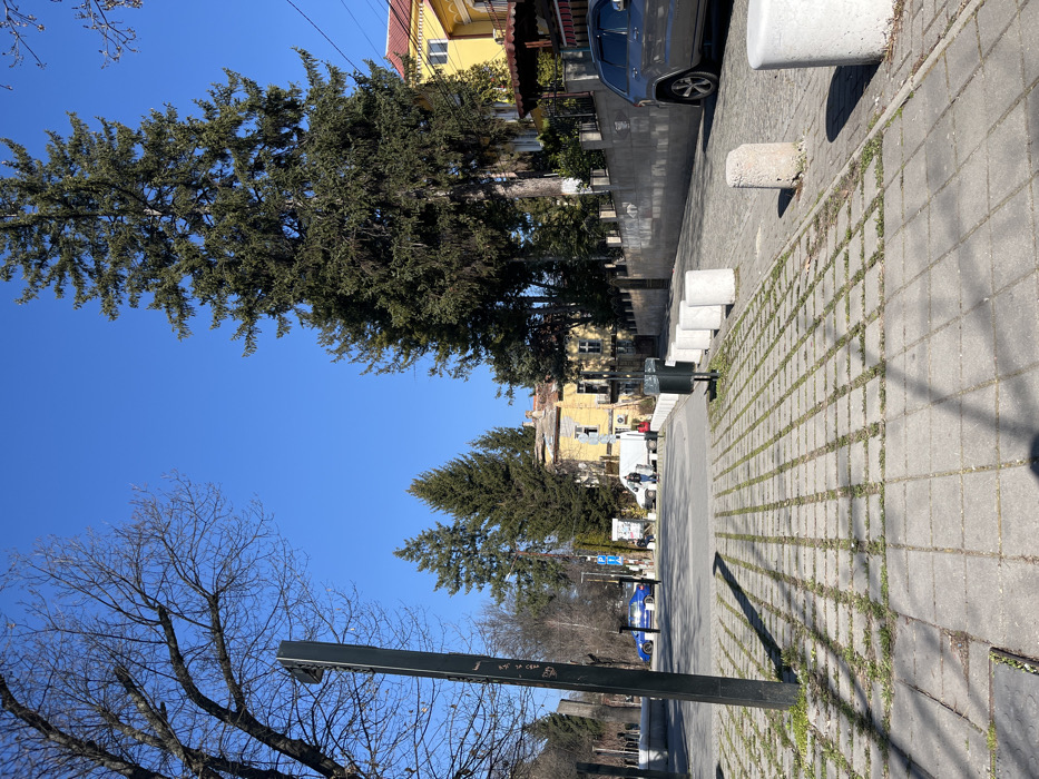 The image presents an outdoor street scene in Bankya, Bulgaria, under a clear blue sky with bright sunlight illuminating the area and casting distinct shadows. In the foreground, a light grey concrete paved surface with a grid pattern of square pavers, many containing small patches of green grass, extends from the bottom of the frame towards the midground. On the left, a dark grey, tall, rectangular metal post, possibly a street light or sign, stands upright. Along the right side of the paved area, a row of white cylindrical concrete bollards demarcates the edge, with one bollard in the immediate lower right being chipped or broken. A dark green public waste bin is positioned behind one of these bollards. The midground features a cobblestone-paved street running horizontally across the scene. A blue sedan is partially visible parked on the left side of the street, facing away from the viewer. On the right side of the street, a silver/grey SUV is parked facing right. Further down the street on the left, a white van is parked. Two indistinct figures are visible near the white van; one appears to be standing, and the other is lower to the ground, possibly sitting or stooping, with a red element of clothing visible. The background consists of several buildings and abundant vegetation. On the right, a multi-story yellow building with a red tiled roof and brown-framed windows is partially visible, obscured by tall evergreen trees and a low concrete wall topped with a black metal fence. Further left, another older-looking yellow building is visible. Numerous tall evergreen trees (pines or spruces) dominate the upper right and central background, alongside several bare deciduous trees on the left, suggesting a late winter or early spring season.