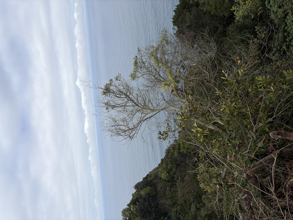 The image displays a high-angle perspective of a coastal landscape in Santana, Portugal, under an overcast sky. The foreground features a partially deciduous tree with numerous bare branches and scattered clusters of green foliage, possibly new growth or epiphytes, emerging from a dense mass of green shrubs and dry, tangled vegetation. To the left, a steep, verdant cliff, densely covered with varied green vegetation, descends towards the ocean. The background is dominated by the Atlantic Ocean, presenting a calm blue-grey surface with minor ripples, extending to a distant horizon line under a uniform layer of white-grey stratocumulus clouds. No individuals or man-made objects are present.