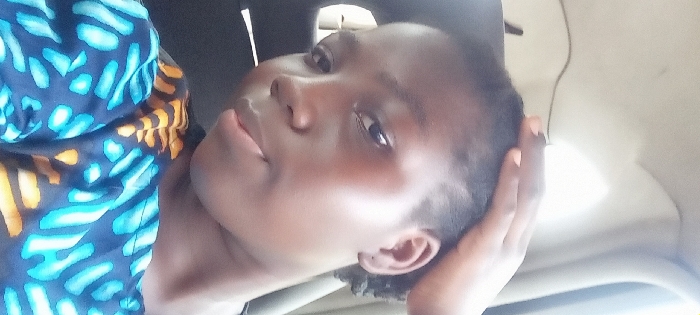 A dark-skinned woman with short dark hair gazes at the camera. Her head is tilted slightly, and her hand gently touches the back of her head. She wears a colorful top patterned with blues and yellows. The background appears to be the interior of a vehicle, with light-colored upholstery visible. The lighting is soft, highlighting her features. Her expression is serene.