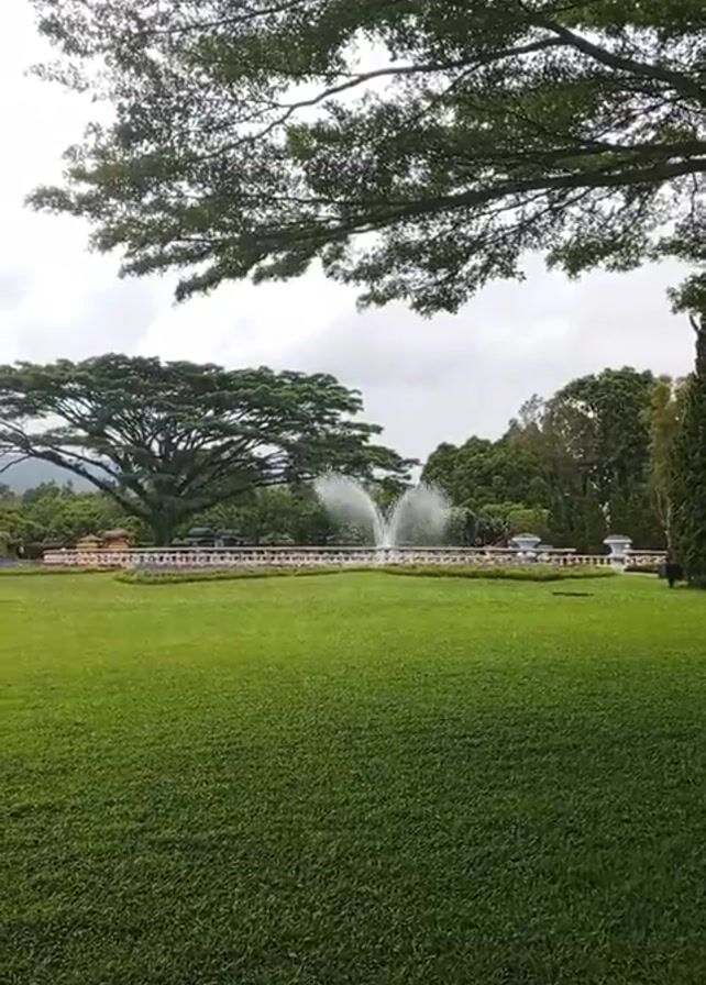 The scene is a broad green lawn in a park-like setting, with a fountain jetting water high into the air in the background. A large, spreading tree stands behind the fountain, flanked by other trees and a white ornamental fence. The sky is overcast, and tree branches frame the top of the shot. The lawn stretches towards the fountain, appearing neatly trimmed. No people are distinctly visible in the scene. The focus is on the natural elements and the park's layout.