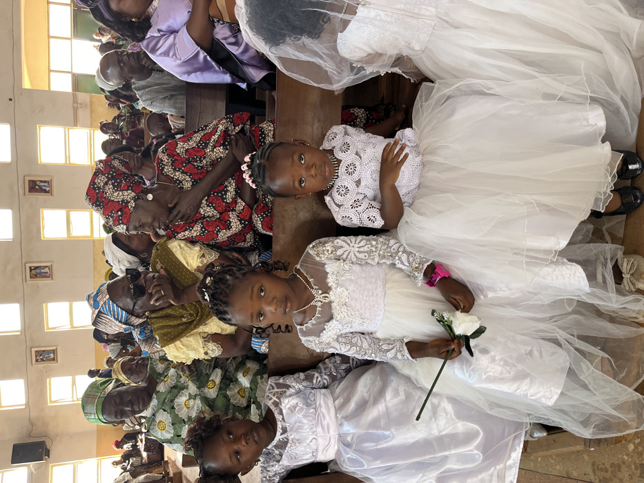 The image depicts an indoor gathering within a large hall or church in Kuru Karama, Nigeria. In the foreground, four young girls, estimated to be between 3 and 8 years old, are seated on a wooden pew. All four wear white formal dresses; the second girl from the left wears a lace and tulle gown, a white beaded necklace, a pink wrist-worn device, and holds a white artificial rose with a green stem. She looks directly at the camera. The girl to her right, younger, also wears a white lace top and tulle skirt with a beaded choker, also looking forward. The fourth girl, partially visible on the far right, wears a white dress and a sheer veil. Behind the girls, several adult women are seated on another wooden pew. Three women are prominent: one on the left in a green patterned headwrap, a central woman in a blue and white patterned headwrap and dark sunglasses, with her chin resting on her hand, and a woman on the right in a red, black, and white patterned headwrap and top, appearing to address the central woman. Numerous other adults are visible in the background, seated in rows, dressed in various traditional attire. The building features light-colored walls with high, rectangular windows providing natural light, and several framed pictures are mounted on the walls.
