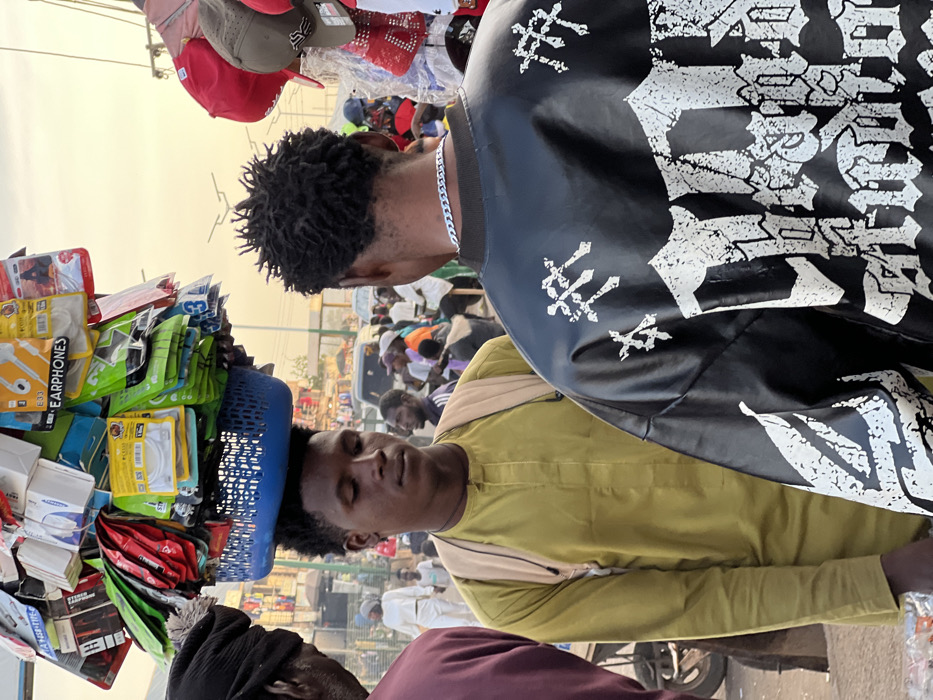 The scene depicts a bustling street or market in Bukuru, Nigeria, during daylight hours, possibly late afternoon. Three individuals occupy the foreground. On the left, a partial view of a person with dark skin is visible, wearing a dark red garment and a black head covering. Central to the image is a young adult male with dark skin, wearing a mustard-yellow long-sleeved tunic and a light-colored backpack. He carries a blue plastic basket on his head, which is filled with various packaged small electronic items, including earphones and cables, indicative of street vending. His gaze is directed downwards or slightly forward. To the right, another individual is seen from behind, also with dark skin and short, spiky black hair. This person wears a black bomber-style jacket featuring large white, distressed, gothic or tribal-style lettering and symbols across the back. A silver-colored cuban link chain is visible around their neck. In the background, numerous people are present, out of focus, moving along a street that appears lined with market stalls or buildings. Vehicles are partially visible further down the street, and modern streetlights are distinguishable against the bright, slightly hazy sky. Caps and hats are displayed on a rack to the right of the person in the black jacket.