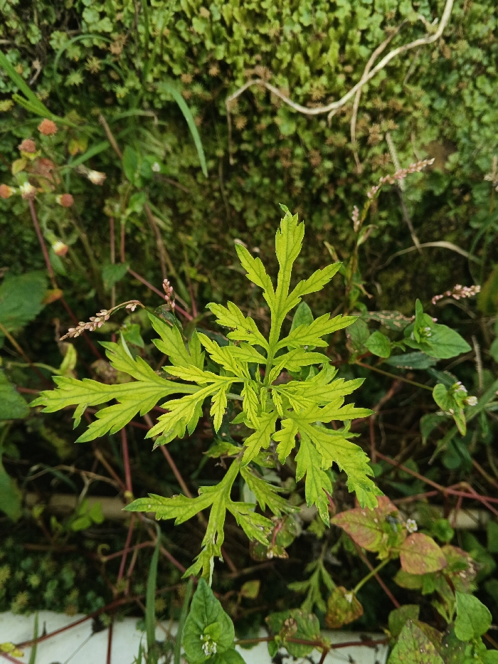 A close-up view captures a vibrant green plant with deeply lobed leaves. The plant is the central focus, surrounded by a variety of other plants and some dead vegetation in the background. Some of the plants have red stems. The overall scene creates a natural and slightly wild aesthetic, as if the plant is flourishing in its natural environment. The lighting appears soft and diffused, enhancing the natural feel of the image.
