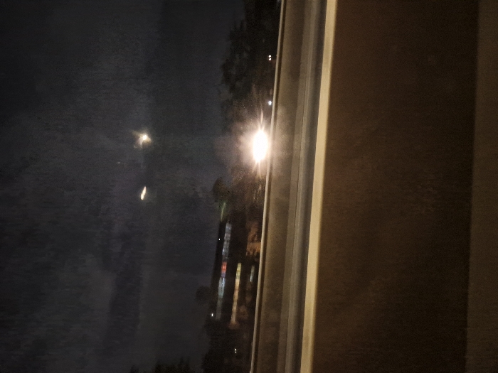 The image depicts a nighttime urban scene captured from an elevated position, specifically from the Nairobi Expressway in Nairobi, Kenya. In the foreground, a prominent light-brown concrete barrier, characteristic of highway infrastructure, spans the lower half of the frame. Above the main barrier, a narrower, lighter-colored horizontal strip runs along its top edge. In the mid-ground, a bright, diffuse white light source dominates the center, likely a street light or a vehicle's headlight, causing a strong glare. To the left of this central light, a blurred, multi-story building is visible with various illuminated windows displaying colored lights (red, blue, yellow, white). Further to the left and slightly higher, a distinct horizontal white light streak suggests a moving vehicle's light. To the right of the central bright light, dark, amorphous shapes consistent with trees or dense vegetation are present. The background consists of a dark night sky, partially obscured by clouds or atmospheric haze, with several smaller, distant point-light sources scattered across the horizon. No individuals or direct interactions are discernible within the frame. The overall environment is an urban elevated highway at night.