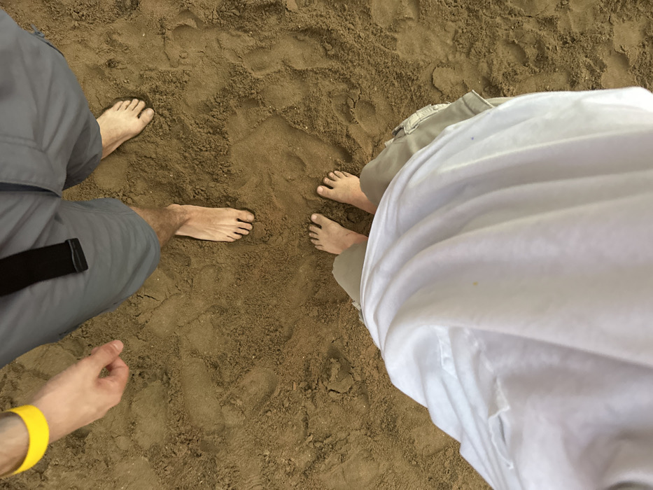 The scene depicts two individuals standing barefoot on reddish-brown sand, characteristic of an outdoor environment such as a beach or sandy riverbank, located in Ban Mae Ping, Thailand. In the foreground, the lower body of one person is visible, wearing light-colored (possibly khaki) shorts, largely covered by a flowing white garment. Their bare feet are placed together on the sand, showing distinct toe impressions. In the background, positioned further away, is the lower body of a second person. This individual wears gray shorts secured by a black belt. Their bare feet are spread apart, with the right foot slightly forward. A left arm, bare from the elbow down, extends from the top left corner, adorned with a bright yellow wristband. The hand is partially clenched. The sand beneath both individuals is disturbed, showing multiple footprints and indentations from prior movement. No other objects or specific actions beyond standing are discernible.