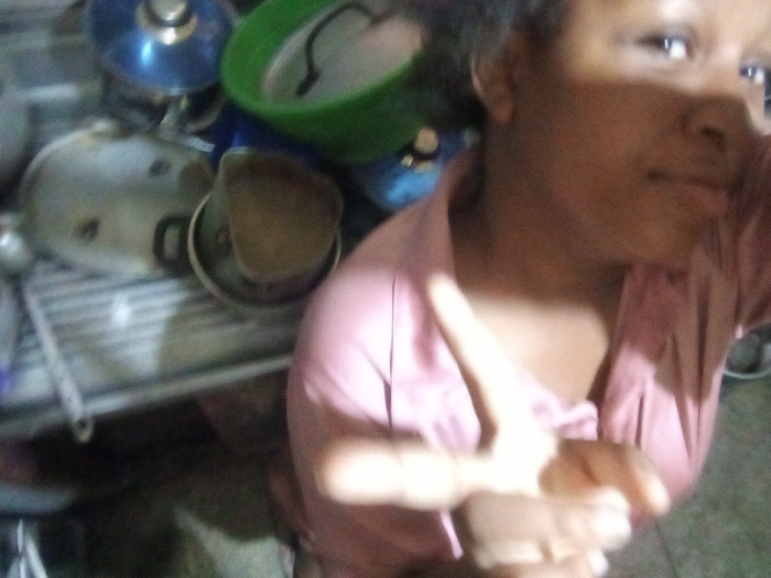 The image depicts an indoor scene, likely a kitchen, in the city of Unknown, Unknown. A person with dark hair and medium skin tone is partially visible on the right side of the frame, wearing a light pink collared shirt. Their right arm is extended towards the camera with the hand appearing to point or gesture. The person's face is partially obscured by shadow and motion blur but appears directed towards the camera. In the background, a collection of kitchen items is visible on a dish rack and a surface. These include a blue pot with a metallic lid, a green bowl, a light-colored pot with a handle, and a small, light brown cup or mug. The items appear unorganized. The overall lighting is somewhat dim, and there is noticeable motion blur, particularly in the foreground around the extended hand.