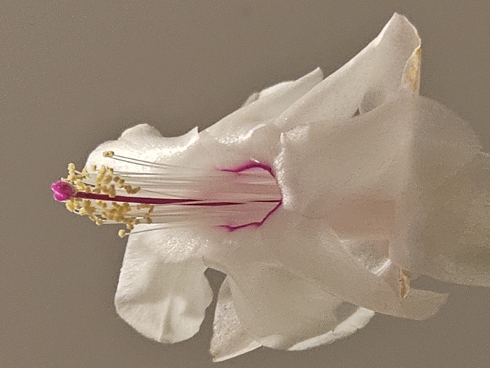 A close-up captures the delicate beauty of a white Christmas cactus flower. Its petals are soft and slightly translucent, curving gracefully around the center. A vibrant pink stigma and a long, thin style protrude, surrounded by numerous filaments topped with yellow anthers. The flower's texture is smooth, with subtle variations in tone highlighting its intricate folds. The backdrop is a muted gray, emphasizing the flower's pure white color.