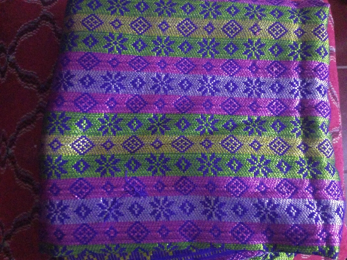 A folded, multicolored woven textile is depicted, displaying horizontal stripes. The stripes feature alternating patterns: rows of dark blue diamond motifs against a lime green or yellow ground, and rows of dark blue star or snowflake-like floral motifs against a purple or magenta ground. The fabric exhibits a visible sheen. It rests upon a dark red patterned textile, which exhibits a faint, repeating design of interlocking ovals or quatrefoils. No individuals are present. The scene is static and appears to be indoors in Bamhori, India.