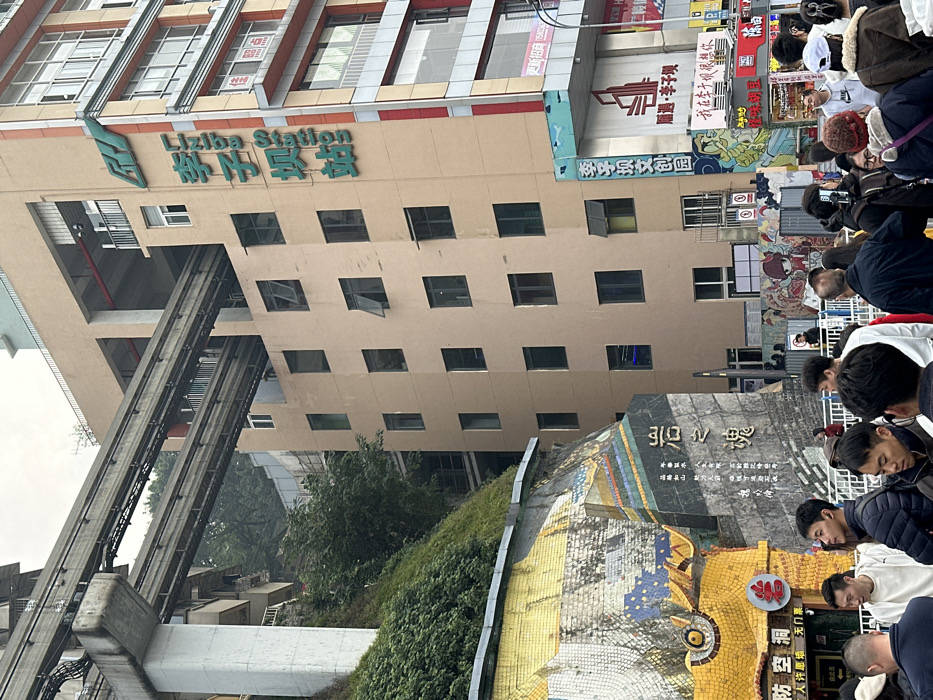 Liziba Station, a building with a monorail passing through it, in Chongqing, China. Below the station is a stone structure with writing in Chinese characters, mosaic tiles, and a yellow decorative piece. Crowds of people are visible, suggesting this is a popular tourist location. There are various signs with Chinese writing on the side of the building as well.