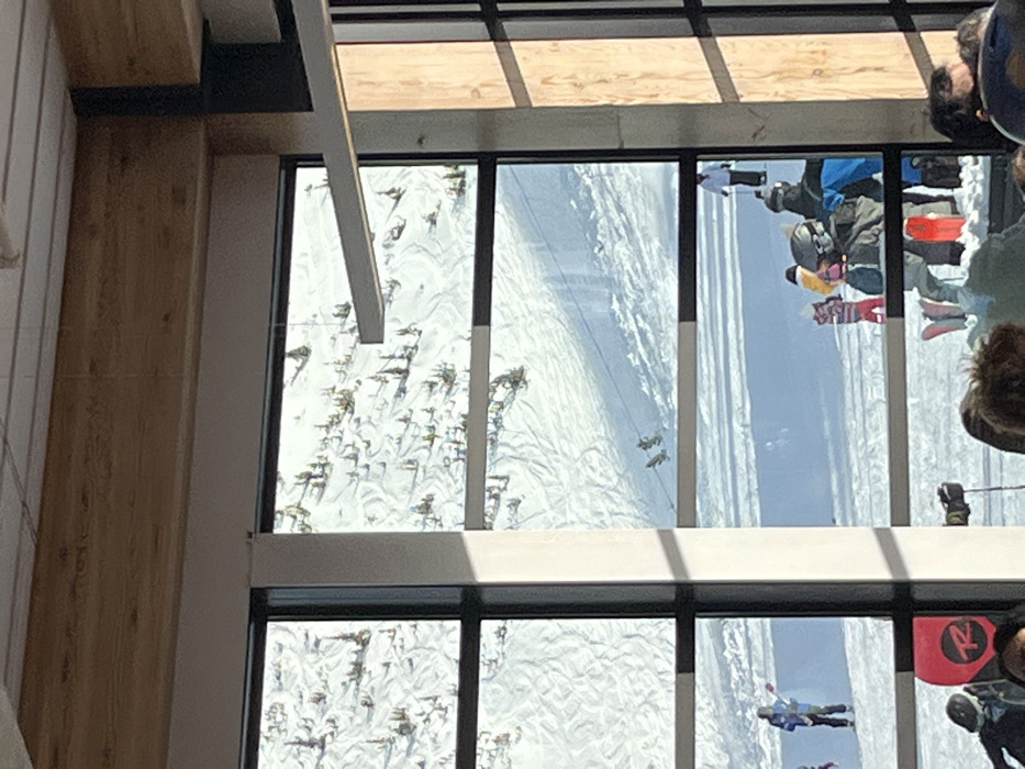 Through a grid of windows, a snowy mountain landscape is visible. Ski lifts ascend a slope covered in sparse vegetation. On the right, skiers and snowboarders pause near a ski run, some clad in bright jackets and helmets. A red ski-area sign is visible near the bottom right. The windows are framed by wooden and white structural elements of the building.