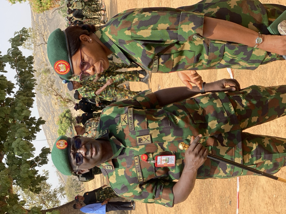 The image depicts an outdoor scene in Kachia, Nigeria, on dry, reddish-brown earth under a clear sky. In the foreground, two individuals wearing Nigerian Army camouflage uniforms and green berets with official crests are prominent. The male on the left, identified by his name tag as "PP MALLA" and an ID card as "PP MALLA THEATRE CDR N.A.," wears dark-rimmed eyeglasses and holds a ceremonial walking stick with a gold knob in his right hand. He has a serious expression and looks slightly to his right. The female on the right, also wearing dark-rimmed eyeglasses, stands facing him, with her left hand slightly extended and holding a small green object with a white patterned fabric. Numerous other individuals, primarily in Nigerian Army camouflage uniforms, are visible standing and moving in the midground and background, suggesting a larger assembly. Sparse vegetation, including a large tree on the left and distant hills with visible rock formations and dry terrain, forms the backdrop.