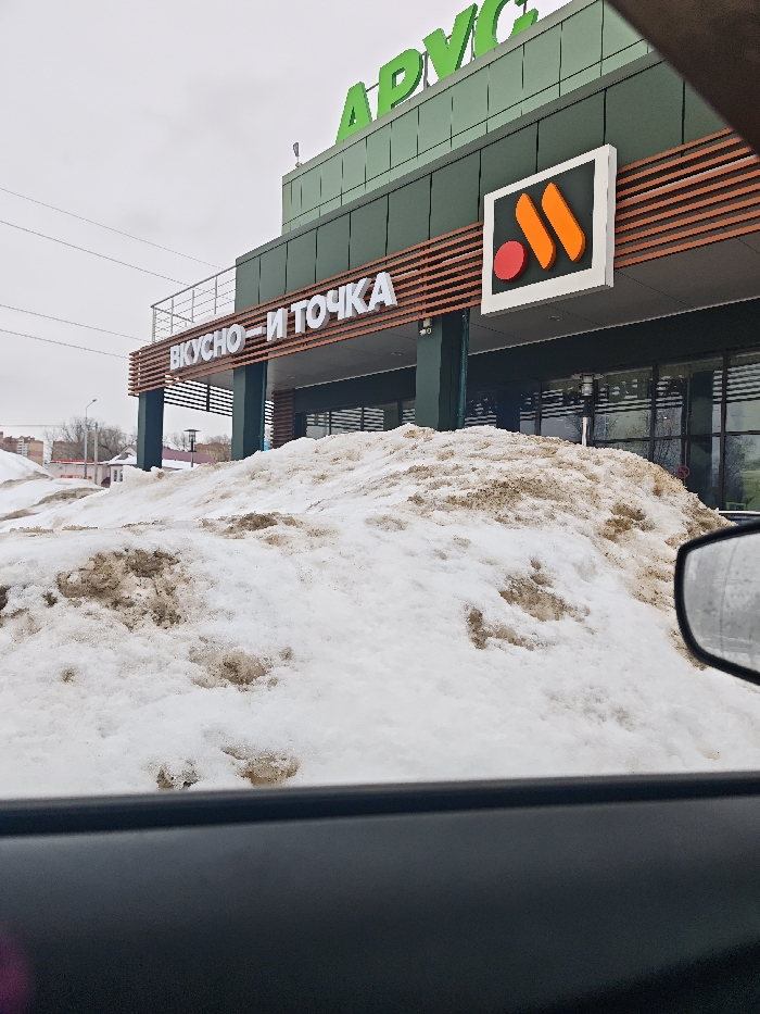The image displays the facade of a commercial building in Dmitrov, Russia, viewed from inside a vehicle. In the foreground, substantial piles of dirty, melting snow partially obscure the lower section of the building, suggesting a late winter or early spring setting. The building's upper section is dark green with horizontal brown slatted accents. Prominently featured are illuminated signs: "ВКУСНО — И ТОЧКА" (Vkusno – i Tochka) in white Cyrillic letters, positioned on the facade, and an adjacent rectangular sign displaying the "Vkusno i tochka" logo (an orange "M" shape with a red dot). Above, on the roofline, large green Cyrillic letters spell "АРУС" (ARUS). The sky is overcast. No individuals are visible. The right edge of a car's side mirror is visible on the right, and the top of a car's interior door frame spans the bottom of the frame.