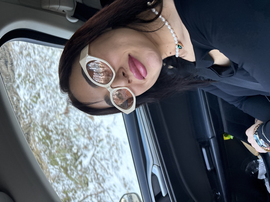 A woman wearing white sunglasses and a pearl necklace with a green gemstone pendant is seen in the driver's seat of a car. She has dark hair and is wearing a black long-sleeved shirt. Her lips are painted a dark pink, and she's sticking her tongue out slightly. The outside view through the car window reveals a snowy landscape. She also has bracelets on her right wrist.