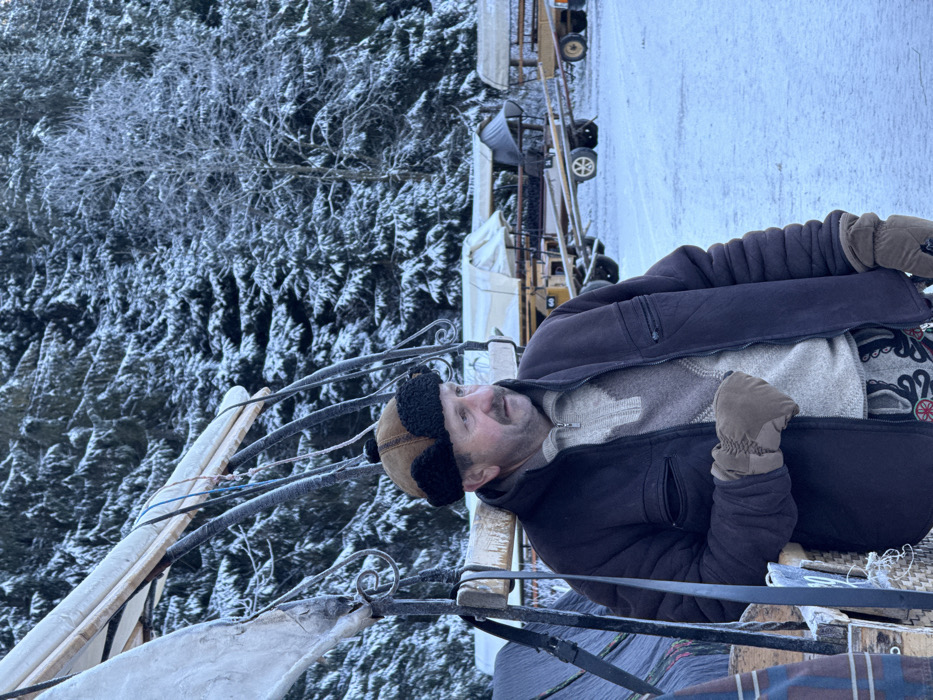 A single adult male is positioned in the foreground of a snowy outdoor scene in Brzegi, Poland. He stands slightly to the left of the frame's center, facing right and gazing off-camera. The man, appearing middle-aged, wears a brown, fur-lined hat with ear flaps, a dark brown quilted jacket, a light beige patterned half-zip sweater, and brown gloves. Partially visible lower attire consists of traditional patterned trousers. He leans against a wooden structure, possibly part of a sleigh or cart, which includes a white canvas cover and dark, frost-covered metal or carved wooden accents. The ground is uniformly covered in snow. In the midground, a line of at least three traditional horse-drawn vehicles, likely sleighs or wagons adapted for snow, are parked. These vehicles are primarily yellow-orange with white canvas tarps covering their passenger areas, and some feature visible wheels. A number "60" is discernable on one vehicle. The background features a dense forest of snow-laden coniferous trees, with a few deciduous trees also frosted. The overall environment indicates a cold, winter day.
