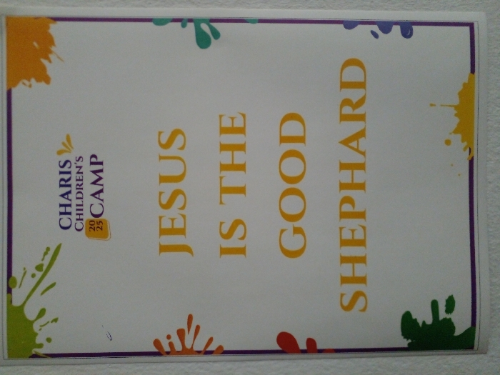 A vertical print document is observed in Narayi, Nigeria. The document features a white background framed by a thin purple border. Multicolored paint splatters in shades of green, orange, red, yellow, teal, and purple are present along the edges and corners. At the top, the text "CHARIS CHILDREN'S CAMP" is displayed in dark blue and orange, with the numerals "20 25" enclosed in a yellow square positioned between the words "Charis" and "Camp". The main message, centrally located and presented in large, gold-orange capital letters, reads: "JESUS IS THE GOOD SHEPHERD." Minor surface imperfections are visible on the document. No individuals, actions, interactions, or specific environmental details beyond the document itself are discernible within the image frame.