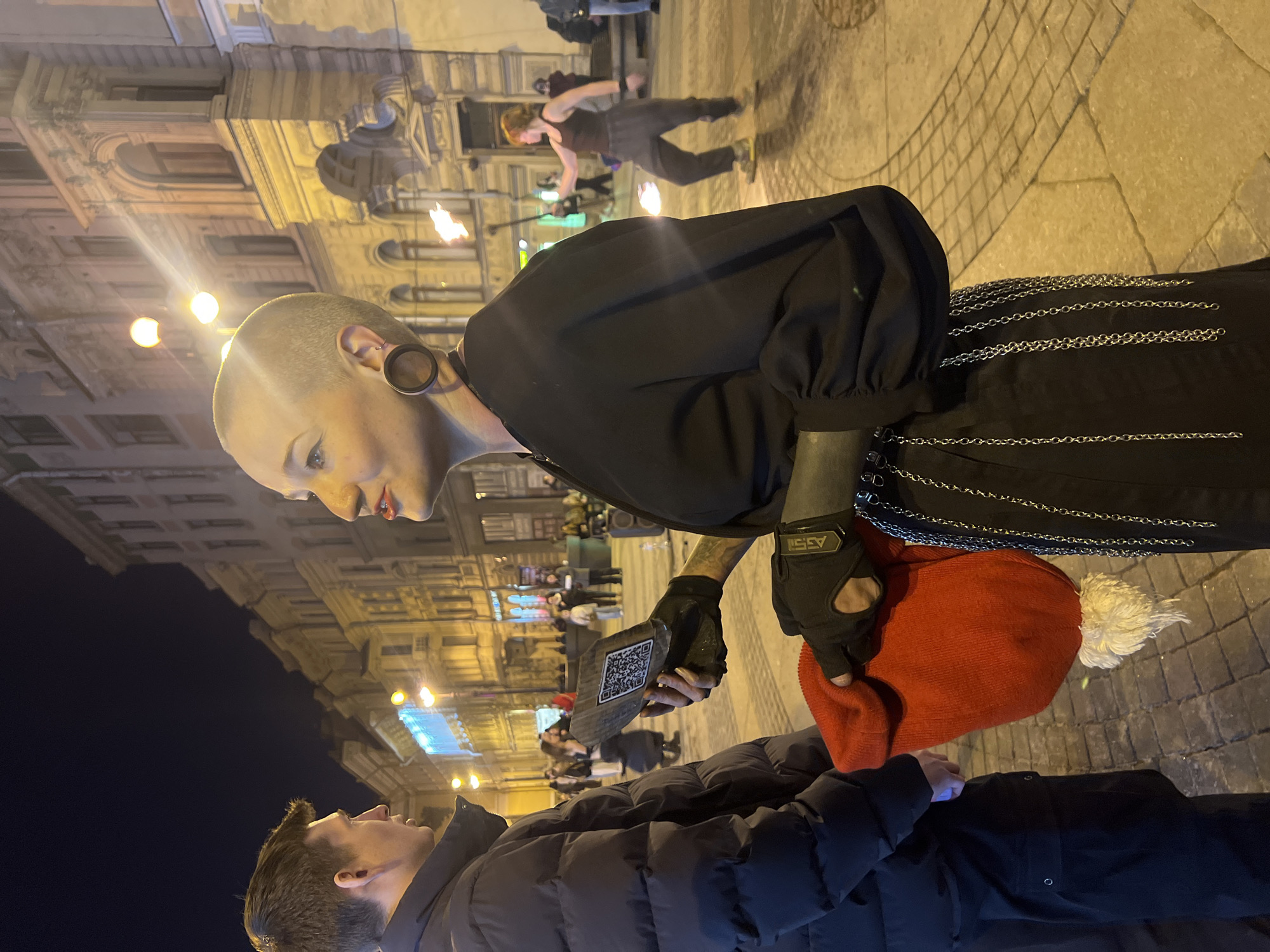 A medium shot taken at night captures a street scene in Saint Petersburg, Russia, with two people in the foreground and other people and a fire dancer in the background. The foreground features a fair-skinned person with a shaved head and a large gauge earring. They are holding a small, wooden-like block with a QR code on it in their gloved left hand and a red knitted hat with a white pompom in their right hand. They are wearing a black outfit with silver chains. In front of them is another person with short dark hair, wearing a dark puffer jacket and looking upwards. The background shows other people on the sidewalk and a fire dancer performing with flames. The backdrop is a large, ornate building with lit windows. Streetlights are visible in the background, illuminating the scene. The ground is paved with cobblestones.
