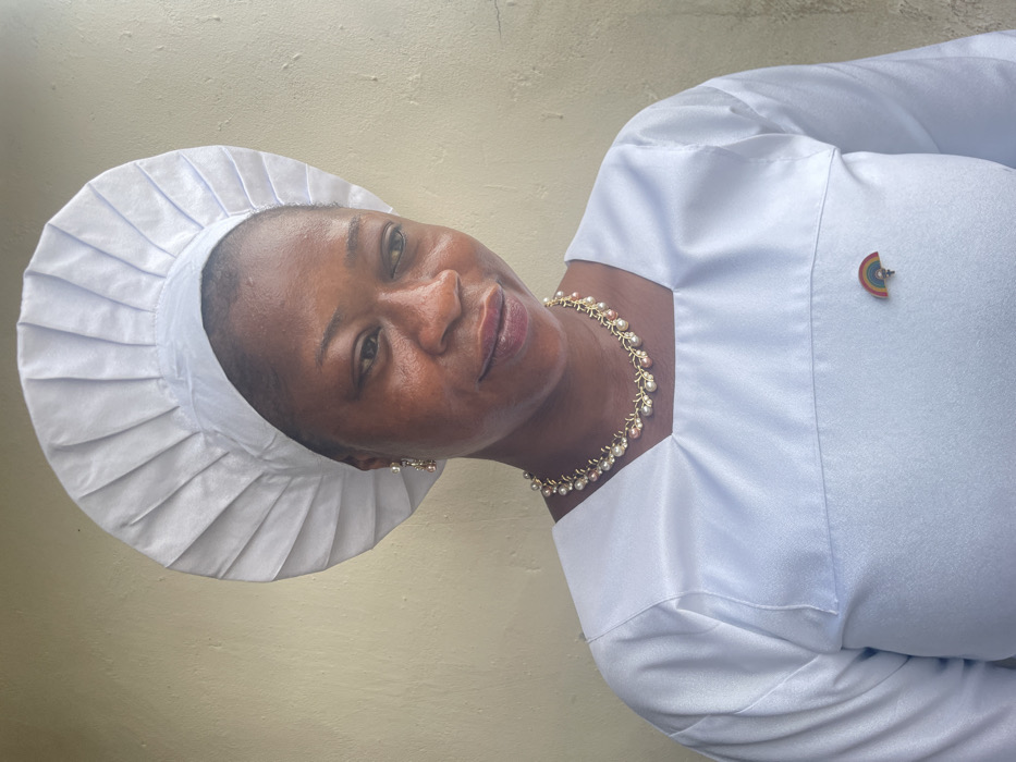 An adult female is depicted in a close-up, chest-up portrait shot against a light yellowish-beige wall. She is positioned slightly off-center, looking downwards and to the right with a faint smile. She wears a white, pleated, circular head covering and a long-sleeved white garment featuring a square neckline. Adorning her neck is a gold-toned necklace with alternating light and pinkish pearl-like beads. A single dangle earring with multiple clear stones is visible on her left ear. A small, colorful rainbow-shaped lapel pin is affixed to the right side of her chest. The scene is located in Badagry, Nigeria.