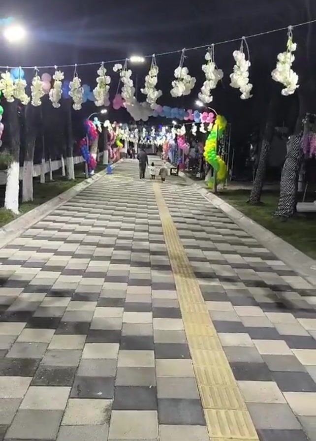 The video captures a park pathway at night, illuminated by overhead lights strung with white floral decorations and colorful balloons