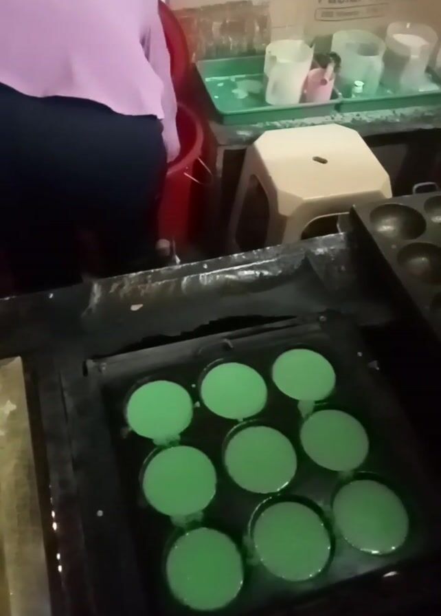 person cooking small, round, green-colored pancakes on a specialized grill. The grill has eight circular indentations, each filled with the pancake batter. The person is wearing a pink hijab and is partially visible in the bottom left corner of the frame. The surrounding area appears to be a cluttered kitchen or food preparation area. A box of MONTISS Facial Tissues is visible in the background, along with several small plastic cups and other cooking-related items. Another grill, with smaller, round indentations, is stacked behind the pancake grill. The lighting is somewhat dim, casting shadows on the scene.