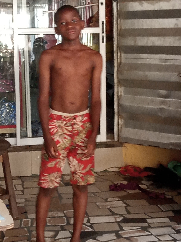 A young, dark-skinned male subject, estimated between 8-12 years of age, stands barefoot in a relaxed posture, facing the camera with a slight smile