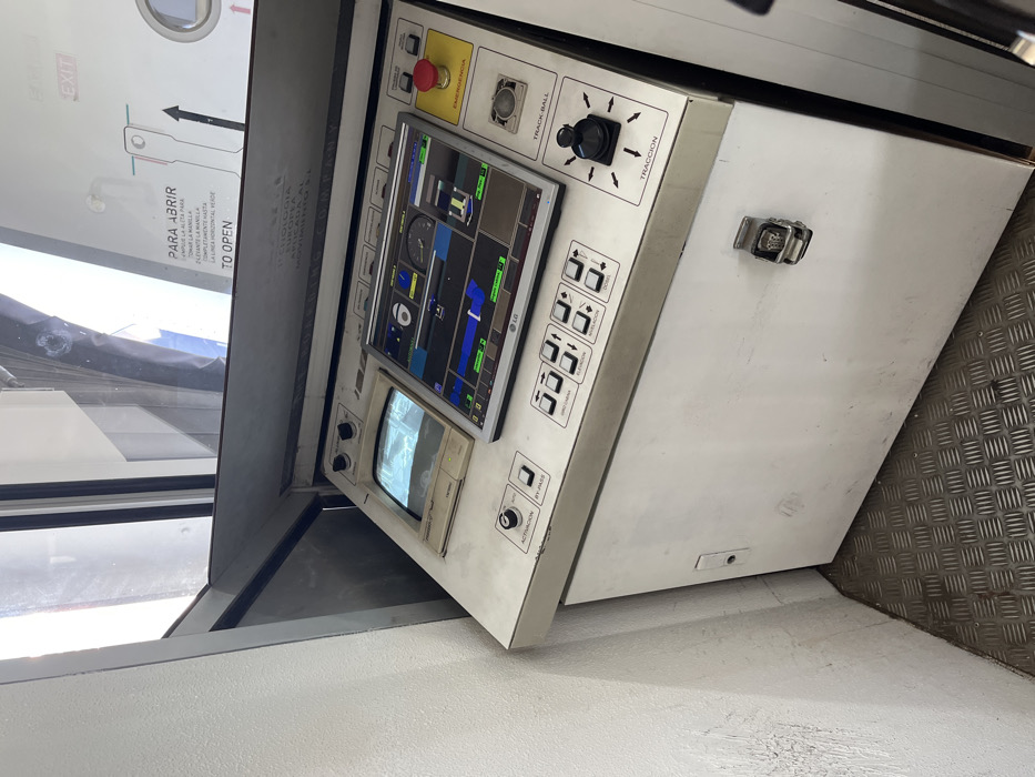A control panel features a modern LG display showing system schematics above a smaller, older CRT monitor. The panel includes an emergency stop button, a trackball, a traction control joystick, and various labeled pushbuttons. Instructions in Spanish and English are visible, including “PARA ABRIR” (“TO OPEN”), with directions for opening a door. Another label indicates “EMERGENCIA” and “EXIT.” A latch secures the panel's side. The panel itself appears to be painted metal and sits near a floor that has both smooth painted and diamond-plate sections.