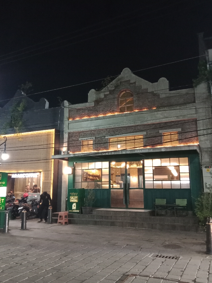 This nighttime scene depicts a commercial street in Semarang, Indonesia. The central focus is a two-story building, identified as "Forty Two Bakeshop" by text on its awning. The upper floor features a brick facade, a stepped gable, and an arched window, illuminated by strip lighting. The ground floor displays large, dark green-framed windows and a central entrance, accessible via concrete steps from the sidewalk. Two dark green chairs and a small table are situated on a raised platform outside the entrance. A green "PREMIO VALET PARKING" sign is positioned to the left of the entrance. To the immediate left, an adjacent, brightly lit building with a modern, horizontally slatted facade is visible, displaying partially discernible text that appears to read "ARAMIC COFFEE." Several motorcycles are parked on the patterned paver sidewalk in front of this building. A solitary individual in dark attire stands near the parked motorcycles, facing away from the viewer. Multiple other individuals are visible inside the left establishment, engaged in unspecified activities. The foreground consists of the patterned paver sidewalk, featuring two green bollards and a light-colored, single-step stool. Overhead utility lines are visible across the dark night sky. A utility box is affixed to the right side of the "Forty Two Bakeshop" building.