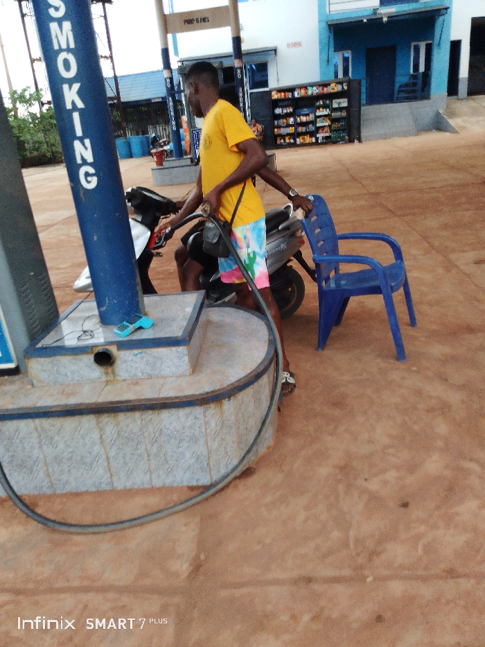 A man in a yellow shirt and colorful shorts stands at a gas station, fueling a moped. The gas pump is blue with "SMOKING" printed vertically. Next to the moped is a blue plastic chair. Behind them is a building with blue accents and a display of goods. The ground is reddish-brown.