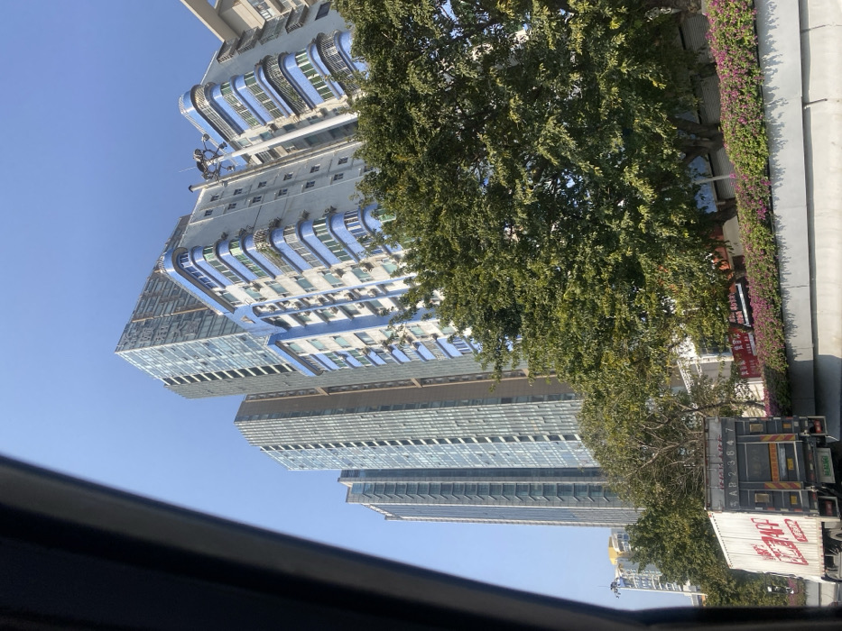 A tall building complex with blue balconies and glass facades dominates the scene. The architecture is modern, with stacked horizontal layers. A dense green tree partially obscures the view of the buildings. To the right, a wall covered in flowering vines runs vertically. A large white and red truck is parked along the street. The shot is taken from inside a vehicle.