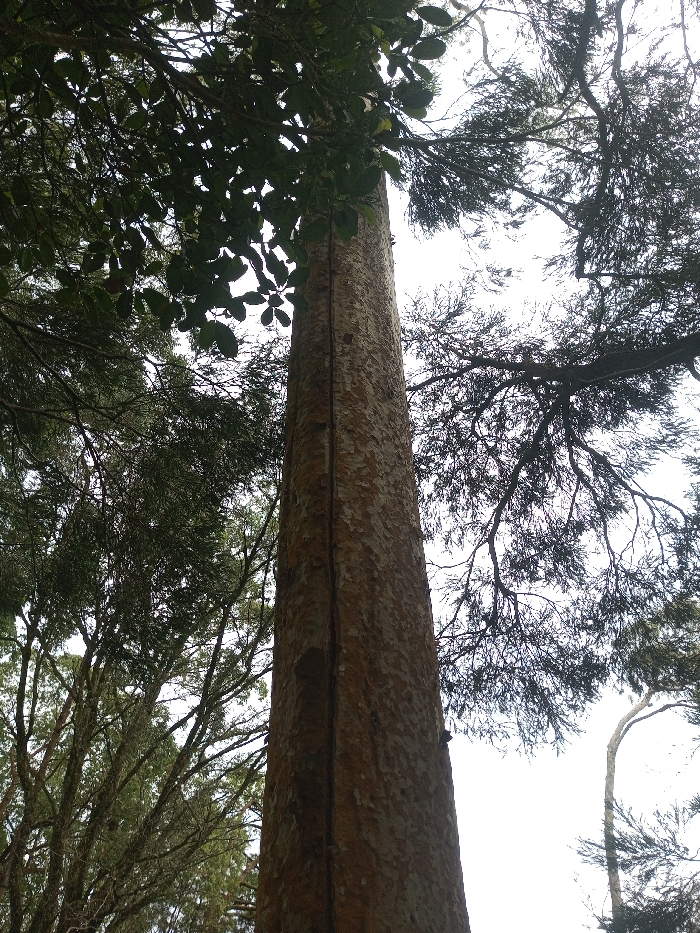 A tall, straight tree trunk dominates the view, seemingly split down the middle by a prominent vertical line. The bark is light brown with a textured surface. The tree is surrounded by other trees with dense, green foliage and fine, dark branches, suggesting a forest setting. A bright, overcast sky peeks through the canopy above, providing contrast to the darker branches and leaves. The perspective is from below, looking upwards.