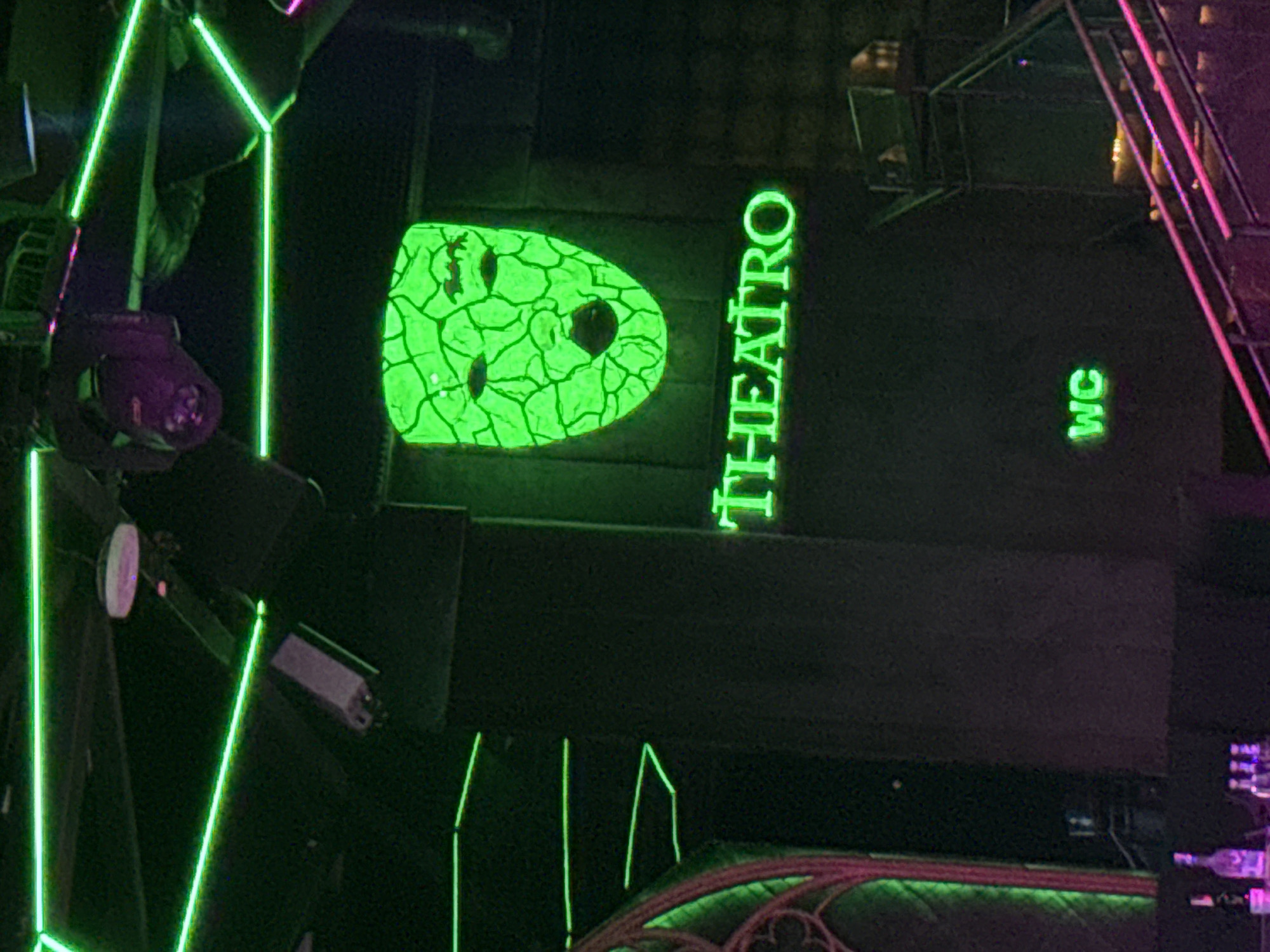 The image displays the dimly lit interior of Theatro by The Black Swan, a nightclub located in Sofia, Bulgaria. Dominating the upper center is a large, textured mask, illuminated brightly in neon green, depicting stylized facial features with a cracked appearance. Below this mask, the word "THEATRO" is spelled out in large, luminous neon green capital letters. Further below and to the left, the letters "WC" are illuminated in smaller neon green text. The environment is characterized by dark surfaces and vibrant artificial lighting. A network of thin, bright neon green light strips forms geometric patterns across the ceiling and upper walls. Several purple and pink spotlights or stage lights are visible mounted overhead. To the far left, a gothic-arch-style architectural detail, also accented with green neon, is partially visible. In the lower right corner, a staircase with pink-illuminated railings ascends diagonally. A bar counter, holding several bottles, is partially visible in the lower left foreground. No individuals are present or engaged in any discernible actions within the captured scene.