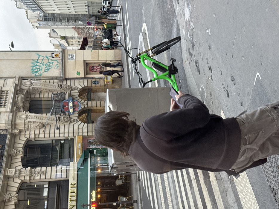 This image captures a street scene in Paris, France, specifically depicting an entrance to the Paris Metro system. In the foreground, a person with shoulder-length dark brown hair, wearing a dark gray top and light brown cargo-style pants, is viewed from behind, holding and interacting with a black smartphone horizontally. A black bag strap crosses their right shoulder. To their right, a bright neon green electric bicycle with a distinctively curved frame and "XCYC" branding is parked on the asphalt street, leaning slightly. A large, light-colored utility box stands between the foreground person and the bicycle. In the mid-ground, a pedestrian crosswalk with white stripes spans the street. The background features a classic Parisian building with an ornate stone facade, housing a "METRO" station entrance marked by its iconic red and blue sign and decorative ironwork. Adjacent to the Metro entrance, another building hosts a cafe or restaurant with a green awning partially displaying the word "ENTIER" and outdoor tables and chairs. Green spray paint graffiti is visible on the upper wall of a building next to the Metro entrance, below which are a yellow sticker with a QR code and a small green character sticker. Several other individuals are present in the background: two men walk near the Metro entrance, and further down the street, a person walks a small white dog. Additional indistinct figures and parked vehicles are visible in the distance along the street, which is lined with multi-story buildings. The sky is overcast, indicating a cloudy day.