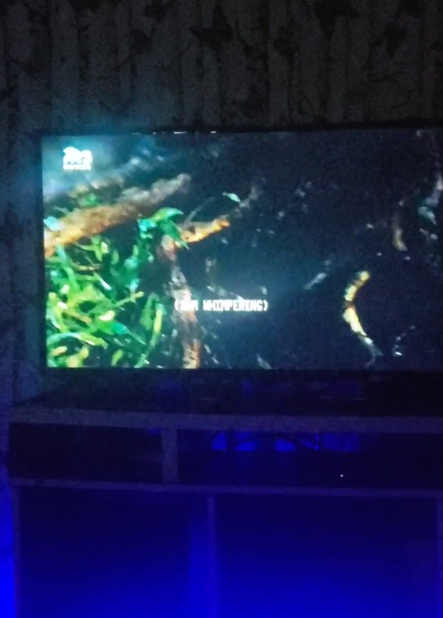 A TV screen shows a nature scene. First, a person is walking in a forest or jungle. Then, the camera zooms in on a small monkey hanging upside down from a tree branch. Finally, a group of small, shiny things is shown in water. There is a brick-like wall behind the TV, and a dark shelf with blue lights to the right of the TV.