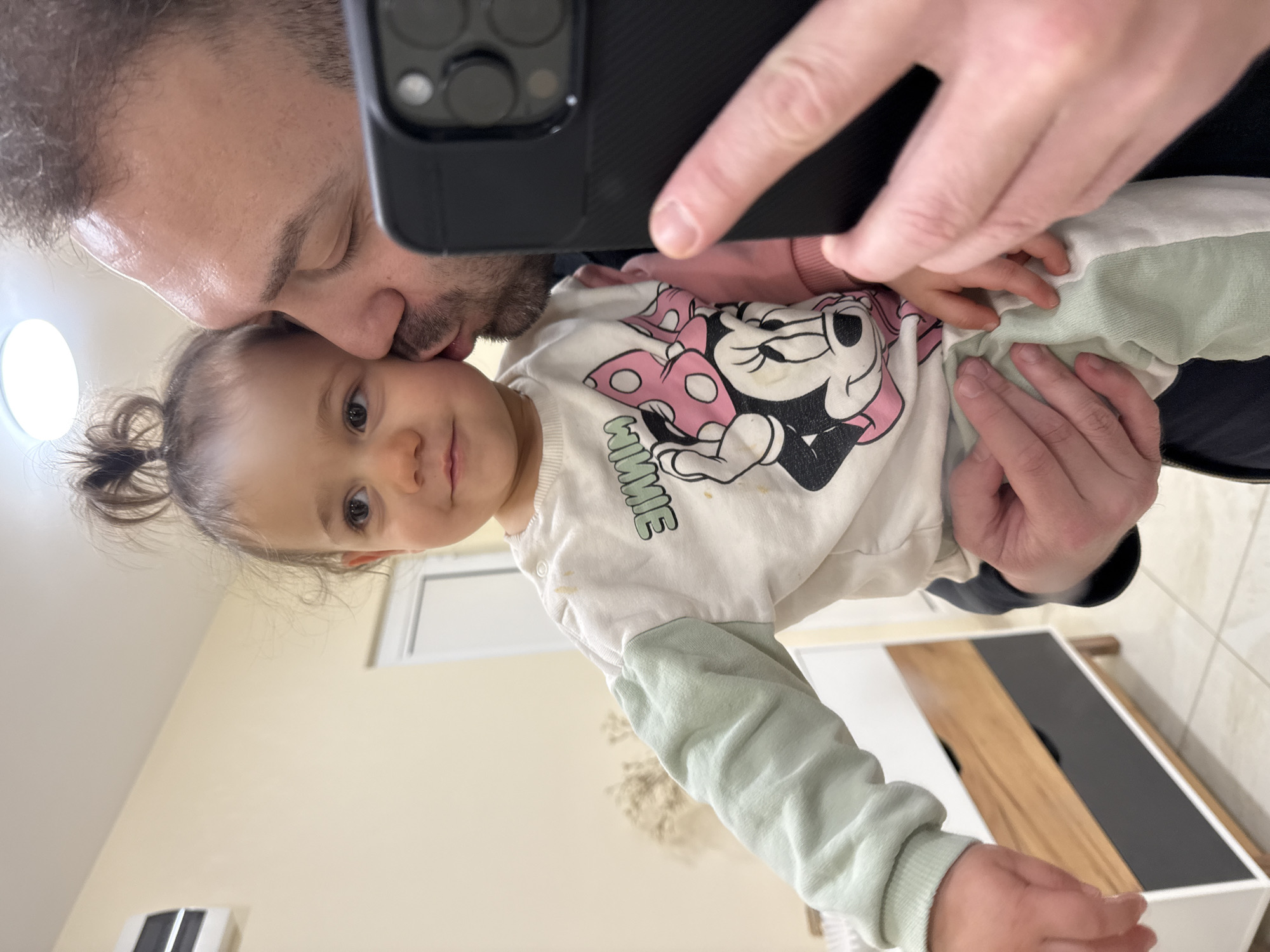 A man with short, dark hair and a beard is kissing a young child's forehead. The child has light brown hair pulled back in a small ponytail and is wearing a long-sleeved shirt with a Minnie Mouse design. The man is holding a black smartphone up, presumably taking a selfie of the two. The background shows a neutral-colored wall, a white door, a small white object on the floor, and a cabinet with a white, wood, and black door. The location and city of Ruse, Bulgaria, are not deducible from the image.