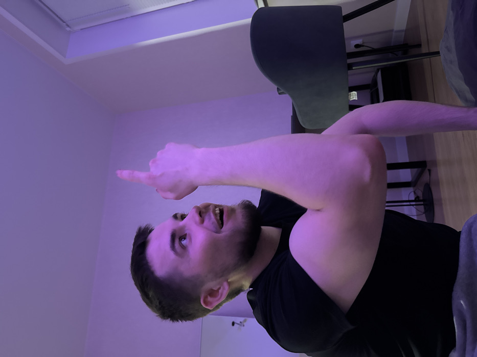 A male individual, appearing to be in his late twenties to early thirties with short dark hair and a light beard, is depicted indoors. He is wearing a black t-shirt and grey sweatpants. The subject is positioned on the lower left of the frame, looking upwards and to his right with an open-mouthed expression suggesting surprise or engagement. His right arm is bent, with the forearm raised and the index finger extended directly upwards. The scene is illuminated by a prominent pink-purple ambient light, casting a strong hue over the man's skin and clothing, as well as parts of the room. In the mid-ground to the right, a dark grey chair with a curved back and black legs is visible. A dark-colored table or desk is partially obscured behind the chair. A window fitted with white horizontal blinds is located in the upper right background. The walls and floor appear light-colored. The specific location within the city of Perm, Russia, cannot be determined from the visual evidence presented in the image.