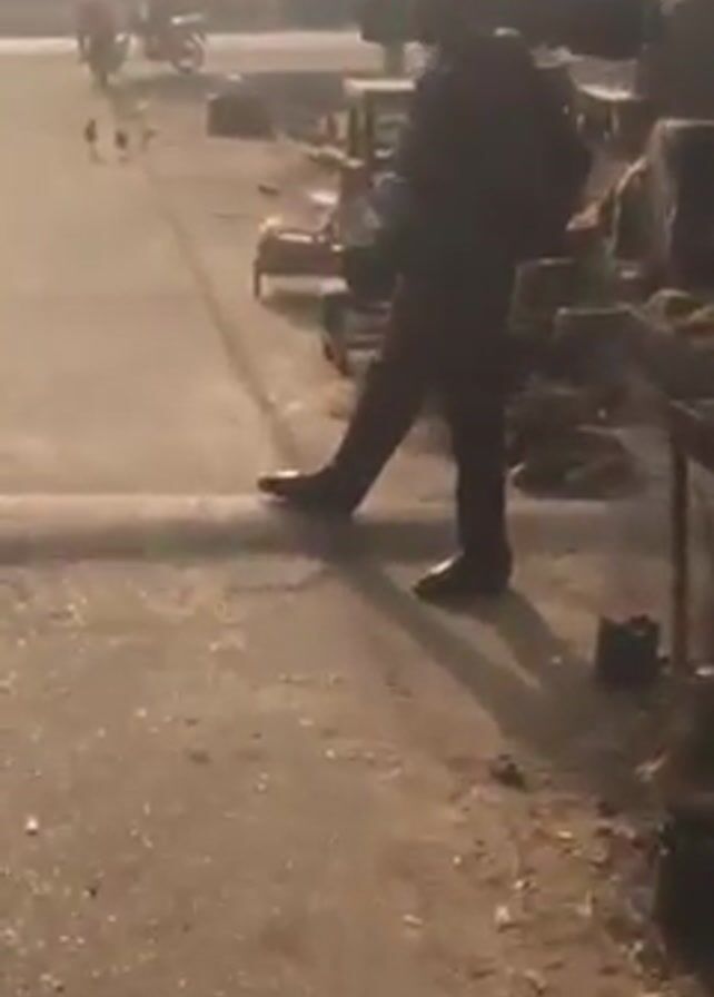 A person in dark clothing is walking on a dirt path. There are several chickens walking ahead of them on the path. To the side of the path is a small roadside market with tables and cookware. A motorcycle is passing by in the distance. The sky appears hazy and light.