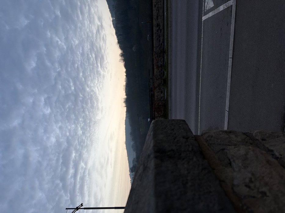 The image presents an outdoor, static scene in Grevenmacher, Luxembourg, under an overcast sky. The immediate foreground on the left features a substantial, rough-hewn stone wall composed of light grey blocks, partially obstructing the lower-left portion of the frame. Adjacent to this, an asphalt road stretches across the middle and right foreground, delineated by a solid white edge line and a dashed white lane marker. A partial white arrow symbol is visible on the asphalt at the bottom-right corner. Beyond the road, a low, darker wall or embankment supports sparse, leafless deciduous vegetation, indicating a non-summer season. Further in the distance, a white vehicle, resembling a van, is visible on the roadway, moving towards the left. A second, darker vehicle is partially discernible to its right. The midground and background consist of a series of dark, undulating hills heavily covered with bare trees. A slender utility pole with a horizontal cross-arm extends upwards on the far left, positioned behind the foreground stone wall. The sky is uniformly covered with dense, grey altocumulus or stratocumulus clouds, exhibiting a slightly lighter tone near the horizon, suggesting diffused, low-light conditions. No individuals are present in the frame.