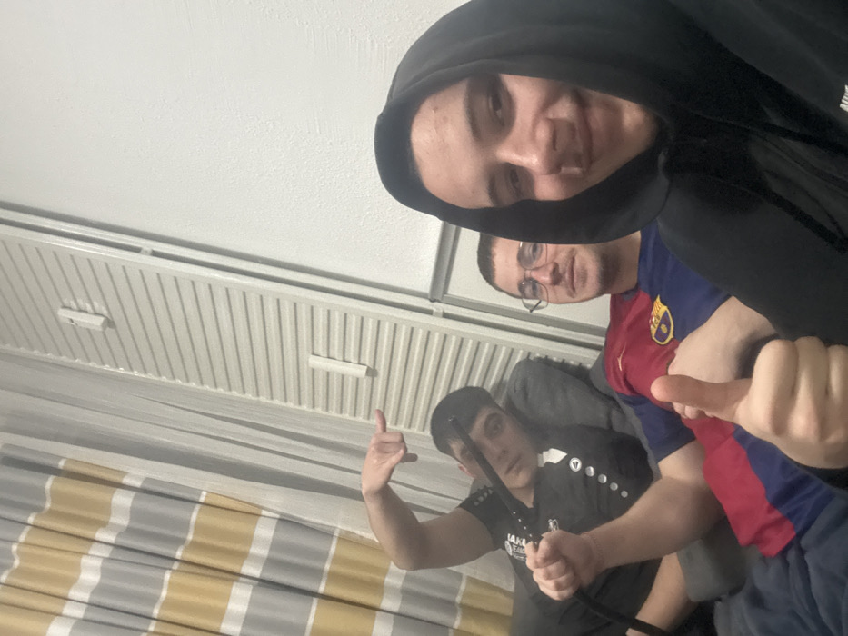 This indoor photograph captures three young males in a casual setting in Krems an der Donau, Austria