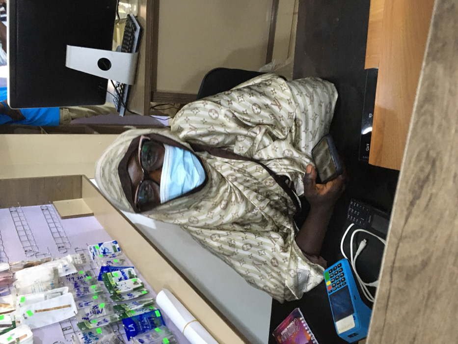 An indoor image depicts a commercial setting in Jos, Nigeria. In the foreground, an adult individual with dark skin is seated behind a dark counter, looking directly at the camera. They wear light-framed glasses, a light blue disposable face mask, and a beige head covering featuring a repeating monogram pattern. Their hands rest on the counter, holding a dark-colored smartphone. On the counter from left to right, a spiral-bound notebook, a blue POS terminal, a white USB cable, and a black feature phone are visible. The background on the left features a light purple pegboard wall displaying multiple small, transparent plastic pouches of merchandise, and a roll of white paper on a shelf. The background on the right shows a silver Apple iMac computer monitor and keyboard on a wooden desk, with a partially visible person in a blue shirt standing behind it. The exact location within Jos is not identifiable from the visual evidence.